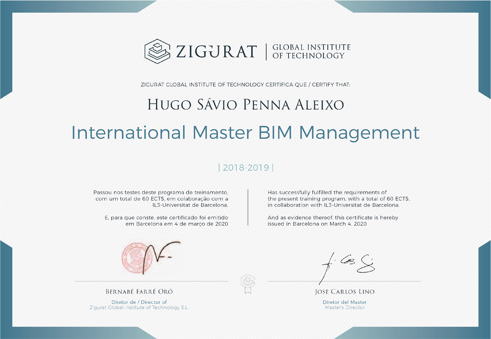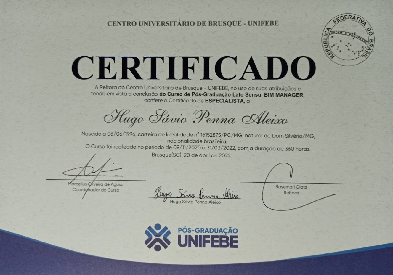 Hugo Aleixo, graduado em Engenharia Civil pela Universidade do Estado de Minas Gerais – UEMG em 2018 , Pós Graduado no Master Internacional BIM Manager pela Zigurat no Global Institute of Technology em 2020, Pós Graduado em BIM Manager pela UNIFEBE (Validação da pós realizada na Zigurat no Brasil) em 2021, Mestre pela Universidade Federal de Minas Gerais – UFMG em Gestão na Construção Civil com ênfase em Facility Management por meio da metodologia BIM. Possuo mais de 8 anos de experiência com a metodologia BIM com foco em processos de implantação, coordenação e desenvolvimento de projetos residenciais, comerciais, institucionais e industriais de diferentes disciplinas. Especialista no software Revit, visando a otimização e atribuição de informações aos modelos. Especialista em coordenação e compatibilização de projetos por meio da metodologia BIM, com a utilização de softwares como Navisworks e Solibri com foco na redução de custos e retrabalho no canteiro de obra. CREA: SP - 5071074260